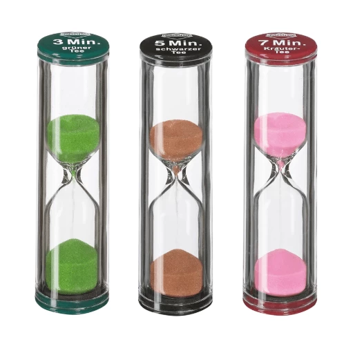 De zandlopers van Küchenprofi zijn gemaakt van kunststof met gekleurd zand en een gekleurde dop. Gebruik de zandlopers voor het timen van 3, 5 of 7 minuten voor het laten trekken van thee.